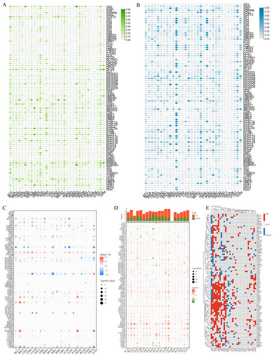 Panoramic view of nucleotide metabolism-related genes (NMRGs) in pan-cancer. (A,B) Histogram displays the frequency of copy number variation (CNV) for each NMRG in each tumor type ((A) amplification; (B) deletion). (C) Heatmap displays the differential methylation of NMRGs in cancers; hypermethylated and hypomethylated genes are denoted with red and blue, respectively (Wilcoxon rank-sum test). (D) Histogram (upper panel) and heatmap demonstrate the number of significant DEGs and the fold change and FDR of NMRGs, respectively, in each cancer. Substantially upregulated and downregulated genes are denoted with red and green, respectively. (E) NMRGs’ survival profiles across cancers.