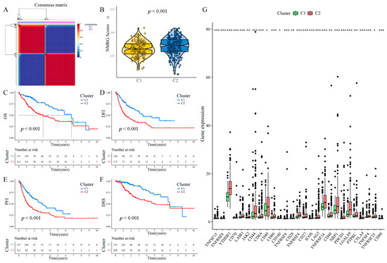 PanNMF clustering identification of two molecular subtypes with remarkably varied prognosis and expression of immune checkpoint genes. (A) The optimal clustering number of 2. (B) NMRG scores of the two subgroups are shown by violin plots. (C–F) Kaplan–Meier analyses (OS, DFI, PFI, and DSS) as regards two molecular subtypes. (G) Differential expression analysis of ICGs. * p < 0.05, ** p < 0.01, *** p < 0.001.