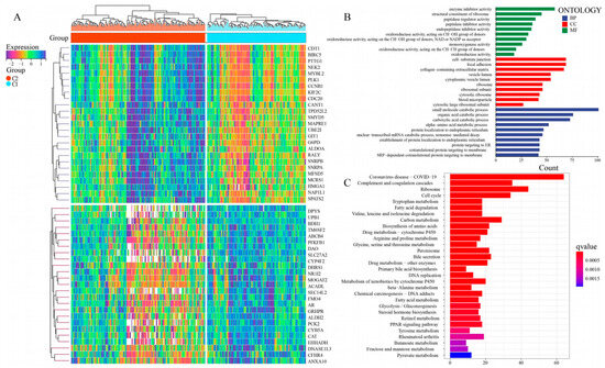 Functional analysis for the NMRG clusters. (A) Heatmap to display mRNA levels of DEGs in two NMRG clusters. (B) The analysis of GO enrichment for DEGs between two clusters. (C) The analysis of KEGG enrichment for DEGs between two clusters.