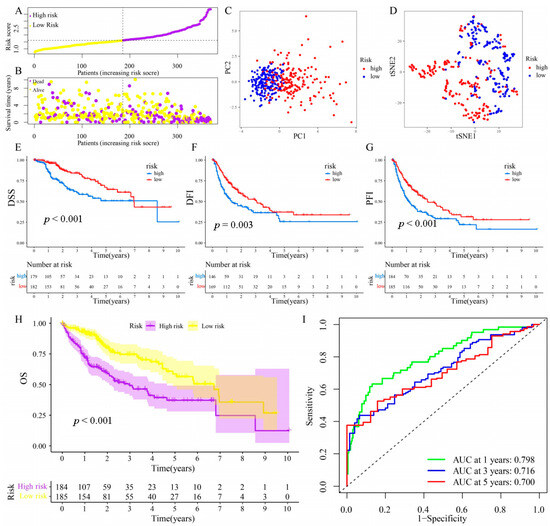 Construction of NMRG-related signature in the train cohort. (A) Various groups of the train cohort were created as per the median risk score. (B) Distributions of risk scores and the cohort’s overall survival status. (C) Train cohort’s PCA. (D) Train cohort’s t-SNE. (E–H) Kaplan–Meier analyses (OS, DFI, PFI, and DSS) of the train cohort. (I) The train cohort’s AUC values for ROC curves.