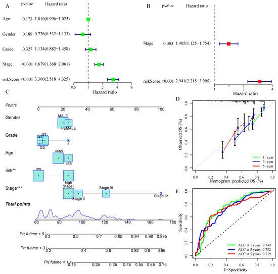 Nomogram (based on risk scores) development and verification. (A,B) Univariate and multivariate Cox regression analyses in the train cohort. (The green nodes in (A) indicate one-factor COX regression analysis, and the red nodes in (B) indicate multifactor COX regression analysis). (C) A nomogram of risk scores and clinical features. (The numbers in the overlapping part of (C) indicate the survival time (years)). (D) Calibration curves were utilized to validate the nomogram’s 1-year, 3-year, and 5-year predictive ability. (E) The AUC values of the ROC curves for improved evaluation of the nomogram’s prognostic ability. ** p < 0.01, *** p < 0.001.