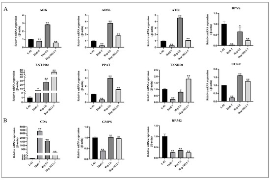 To validate the bioinformatics predictions, we extracted the total RNA from different human HCC cell lines (HuH7, HepG2, and Hep3B2.1–7) and human normal hepatocyte line L-02. The mRNA level of the key genes, namely ADK, ADSL, ATIC, CDA, DPYS, ENTPD2, GMPS, PPAT, RRM2, TXNRD1, and UCK2, were determined. The results showed that the expression levels of ADK, ADSL, ATIC, DPYS, ENTPD2, TXNRD1, and UCK2 in at least one tumor cell line were consistent with the predictions (Figure 7A). We found that the expression levels of CDA, GMPS, and RRM2 in HCC patients were opposite to the predicted results (Figure 7B), which is an interesting phenomenon.