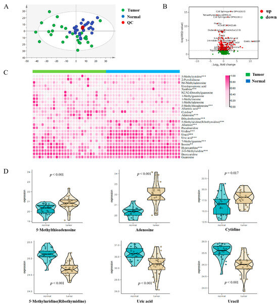 Characterization of the nucleotide metabolism landscape of hepatocellular carcinoma. (A,B) Overall metabolism of patients with hepatocellular carcinoma. (C,D) Nucleotide metabolism in patients with hepatocellular carcinoma. * p < 0.05, ** p < 0.01, *** p < 0.001 versus normal group.