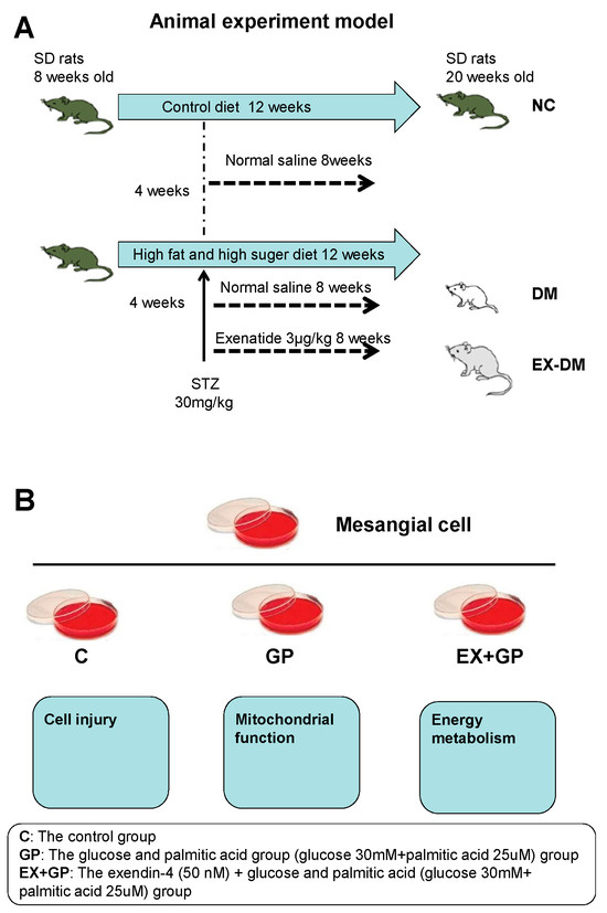 Mouse glomerular mesangial cells (SV40 MES 13) were purchased from the Typical Cell Culture Collection Committee of the Chinese Academy of Sciences Library. The cells were maintained in Dulbecco’s modified Eagle medium (DMEM; which contains 5.5 mmol/L glucose) supplemented with 5% fetal bovine serum (FBS), 100 units/mL penicillin, and 100 μg/mL streptomycin and cultured at 37 °C in humidified air with 5% CO2. Upon reaching 75% confluency, the cells were passaged once every 3 d. The cells were divided into the following groups 24 h after synchronization in a serum-free culture medium: (1) control group (5.5 mM glucose); (2) GP group (30.0 mM glucose + 25 µM palmitic acid); (3) EX + GP group (50 nM exendin-4 + 30.0 mM glucose + 25 µM palmitic acid); (4) M group (5.5 mmol/L glucose + 24.5 mmol/L mannitol); and (5) EX group (50 nM exendin-4 alone). SV40 MES 13 cells were preincubated with 50 nM exendin-4 for 1 h before exposure to GP for 24 h (Figure 1B).