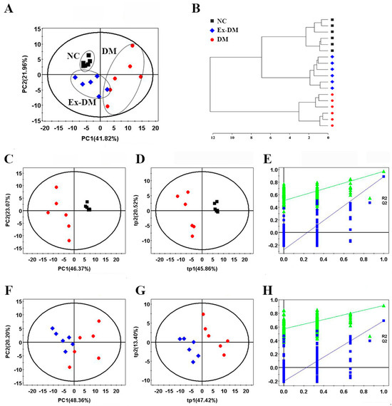 Pattern recognition analysis of the three groups. (A) PCA score plot of the three groups. (B) Hierarchical cluster analysis results. (C) PCA score plot, (D) PLS-DA score plot (R2X = 0.664, R2Y = 0.97, Q2 = 0.889), and (E) PLS-DA cross-validation plot from DM and NC groups. (F) PCA score plot, (G) PLS-DA score plot (R2X = 0.603, R2Y = 0.915, Q2 = 0.692), and (H) PLS-DA cross-validation plot from the ex−DM and DM groups. The ellipses indicate the 95% confidence limit. Cross-validation plots were generated from permutation tests (n = 200) using the first two components (tp1 and tp2). NC, control; DM, diabetes mellitus (DM)−model rats; Ex−DM, exenatide-treated DM-model rats.