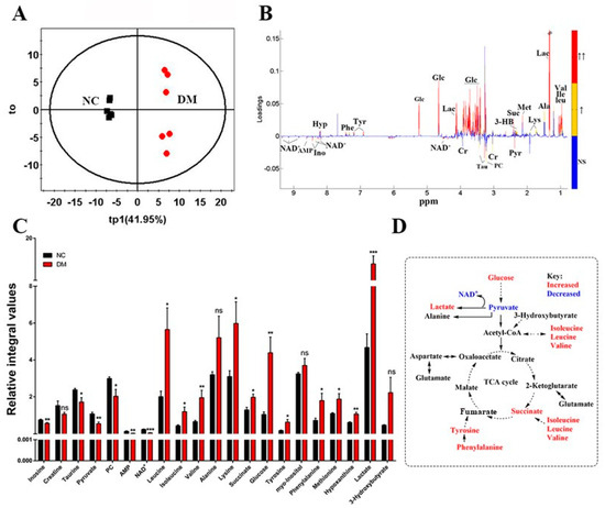 Identification of characteristic metabolites significantly responsible for discriminating between the metabolic profiles of the DM and NC groups. (A) OPLS−DA score plot. (B) OPLS−DA correlation coefficient-coded loading plot identifying metabolites that significantly contributed to the discrimination of metabolic profiles. Red, orange, and blue indicate that the variables are very significant (|r| ≥ 0.708 and VIP ≥ 1), significant (B: 0.576 ≤ |r| < 0.708 and VIP ≥ 1), and insignificant, respectively. (C) Quantitative analysis of the characteristic metabolites between the two groups (Student’s t-test was used: * p < 0.05, ** p < 0.01, *** p < 0.001 with respect to the NC group, ns means no statistical significance). (D) Metabolic pathway schematic highlighting the metabolites that were differentially regulated by DM. Abbreviations: Val, valine; Ile, isoleucine; Leu, leucine; Lac, lactate; Ala, alanine; Lys, lysine; Met, methionine; Suc, succinate; 3-HB, 3-hydroxybutyrate; Glc, glucose; Tyr, tyrosine; Phe, phenylalanine; Hyp, hypoxanthine; Pyr, pyruvate; Cr, creatine; PC, O−phosphocholine; TAU, taurine; Ino, inosine; NAD+, nicotinamide adenine dinucleotide; AMP, adenosine monophosphate. NC, control; DM, diabetic mellitus (DM)−model rat group.