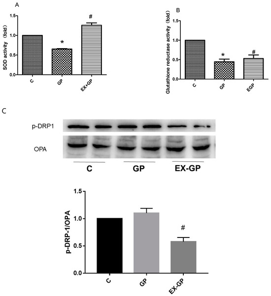 Effect of exendin-4 on the antioxidant ability of mesangial cells. (A) SOD activity was measured using a Superoxide Assay Kit, and (B) GR activity was measured using the Glutathione Reductase Assay Kit. (C) Western blotting detection of mitochondrial kinetic protein (p-DRP/OPA) expression. Data are expressed as the mean ± S.D. (n = 3/group). Statistical significance: * p < 0.05 vs. C, # p < 0.05, vs. GP. C: control, GP: high-fat high-glucose (HFHG) group, EX-GP: exendin-4 + HFHG.