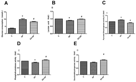 Effect of exendin-4 on energy metabolism in mesangial cells. (A) Glucose consumption, (B) lactic acid concentration, (C) pyruvate dehydrogenase E1 activity, (D) phosphofructokinase activity and (E) succinodehydrogenase activity in each group, were measured using an ELISA kit. (F) Cell viability, (G) succinodehydrogenase activity, (H) lactic acid concentration, (I) pyruvate dehydrogenase E1 activity, and (J) phosphofructokinase activity in each group, were measured using the glucose oxidase method. Data are expressed as the mean ± S.D. (n = 3/group). Statistical significance: * p < 0.05 vs. C, # p < 0.05, vs. GP. C: control, GP: high-fat high-glucose (HFHG) group, EX-GP: exendin-4 + HFHG.