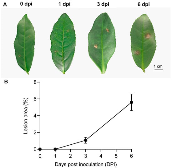Development of gray blight disease on tea leaves over time. Intact leaves were inoculated with mycelia and conidia mixture of P. theae. (A) Representative symptoms on tea leaves using intact plant inoculation. Scale bar = 1 cm. (B) Statistics of disease development on tea leaves assessed at 0, 1, 3 and 6 dpi following fungal inoculation. The combined leaf disease area (cm2) from two inoculations per leaf was calculated as a percentage of the total leaf area using ImageJ software.