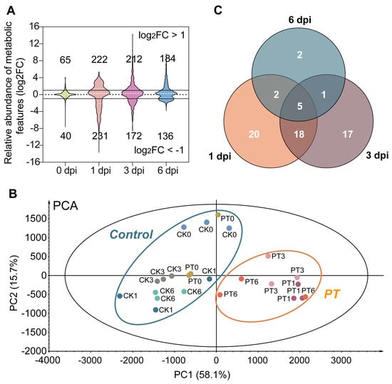 The changes in catechin contents in tea leaves afflicted by gray blight disease have been explored previously [18]. However, the impact of P. theae infection on other defense-related metabolites (e.g., phytoanticipins and phytoalexins) in tea plants remains largely unknown. To gain comprehensive insights into how tea metabolism is altered during pathogenesis, we conducted non-targeted metabolomics profiling of tea leaves subjected to P. theae inoculation or mock inoculation at 0, 1, 3 and 6 dpi. The representative total ion chromatograms of tea leaf metabolic fingerprints at 1 dpi in the negative mode are presented in Figure S1. After excluding fungal metabolites, we detected a total of 5362 metabolic features in the negative ionization mode and 3048 in the positive mode across all samples. Signals occurring at low abundance (maximum abundance < 1000) were removed, retaining 677 and 295 features in the negative and positive modes, respectively. Chemometrics analyses were then performed on the merged data from both modes. Our analysis unveiled dynamic metabolic shifts following fungal inoculation, as indicated by the log2-fold differences in the relative metabolite abundance between the infected groups and the control groups (Figure 2A). As expected, the metabolite profiles of tea samples at 0 dpi were similar between the CK and PT groups. However, at 1 dpi, the infected group displayed the most intense metabolic response among all time points examined, with sharp increases in both up-regulated and down-regulated metabolic features. Studies have shown that the early plant–pathogen interactions typically take place within 24 h post-inoculation, during which pathogens can fully invade and colonize the host tissues [30]. Hence, the direct contact between the tea plant and P. theae likely triggered the activation of the plant’s defense system at 1 dpi. When comparing the pathogen-inoculated group to the mock-inoculated group, there was an increased abundance of 222, 212 and 184 metabolic features and a decreased abundance of 231, 172 and 136 features at 1, 3 and 6 dpi, respectively (Figure 2A). From 1 to 6 dpi, the number of up-regulated features in the PT group compared to CK only slightly declined, whereas the number of down-regulated features decreased by 41%. This sustained up-regulation and lessening down-regulation of metabolic features in response to fungal infection suggest complex and dynamic interactions between the tea plant and the pathogen.