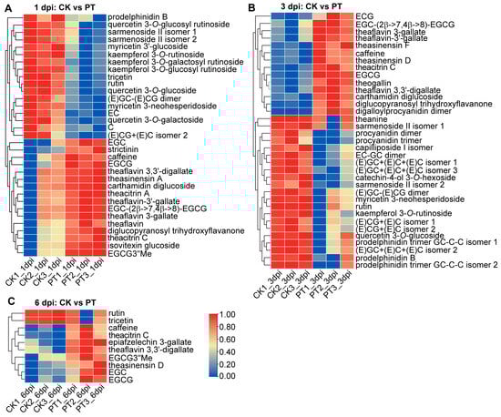 Heatmaps of annotated metabolites showing significant differences between fungal-inoculated and mock-inoculated tea leaves at 1 dpi (A), 3 dpi (B) and 6 dpi (C). Red and blue colors signify increased and decreased levels of metabolites. PT, tea leaves inoculated with P. theae. CK, tea leaves inoculated with the mock control.