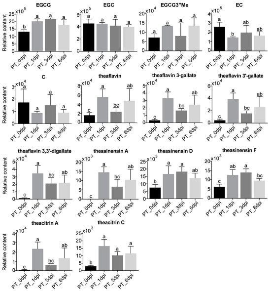 Quantitative analysis of catechins and polymerized catechin derivatives extracted from metabolomics data. The y-axis denotes peak area values obtained through normalization to the “normalize to all compounds function” in Progenesis QI. The relative abundance of each metabolite is presented as mean ± SD (n = 3). Different letters denote significant differences in metabolite contents at different time points, as determined by Fisher’s least significant difference test at p < 0.05.