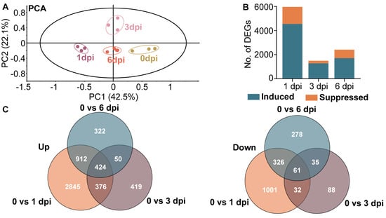 Time course analysis of tea transcriptome reprogramming in response to gray blight infection. (A) Principal component analysis of fungal-inoculated tea leaves at 0, 1, 3 and 6 dpi. (B) Number of differentially expressed genes (DEGs) at each time point. Teal and orange columns indicate up- and down-regulated genes, respectively. (C) Venn diagrams illustrating the number of DEGs up- or down-regulated due to fungal treatment over the time course.