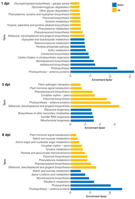 GO classification of DEGs was performed to categorize the unigenes into biological processes, molecular functions and cellular components (Figure S4). Within the biological process category, the DEGs were found to be abundant in GO terms such as “cellular process”, “single organism process”, “metabolic process” and “response to stimulus”. The molecular function category mainly comprised DEGs associated with “binding” and “catalytic activity”. In the cellular component category, highly represented groups included “cell”, “cell part”, “organelle” and “membrane”. We conducted KEGG pathway enrichment analysis on DEGs to investigate the primary metabolic pathways involved in tea plant response. The top 10 enriched up-regulated and down-regulated pathways at 1, 3 and 6 dpi are listed in Figure 6. Key enriched pathways included phenylpropanoid biosynthesis, flavonoid biosynthesis, photosynthesis, amino acid metabolism, starch and sucrose metabolism, plant–pathogen interaction and plant hormone signal transduction. Three pathways—“phenylpropanoid biosynthesis”, “flavonoid biosynthesis” and “photosynthesis-antenna proteins”—were commonly enriched across all time points. Previous studies have demonstrated that pathogen-infected plant leaves often experience a decrease in photosynthetic rates due to disturbances in the photosynthetic machinery [40]. In line with this, our studies also found that P. theae infection, particularly at 1 dpi, disrupted pathways related to photosynthesis, such as “photosynthesis-antenna proteins”, “carbon fixation in photosynthetic organisms” and “porphyrin and chlorophyll metabolism” (Table S4). The disruption of photosynthesis may have broader implications for plant defense, as the chloroplast plays a pivotal role in fortifying plant immunity through the synthesis of a diverse array of molecules, hormones and proteins that possess antimicrobial properties [41].