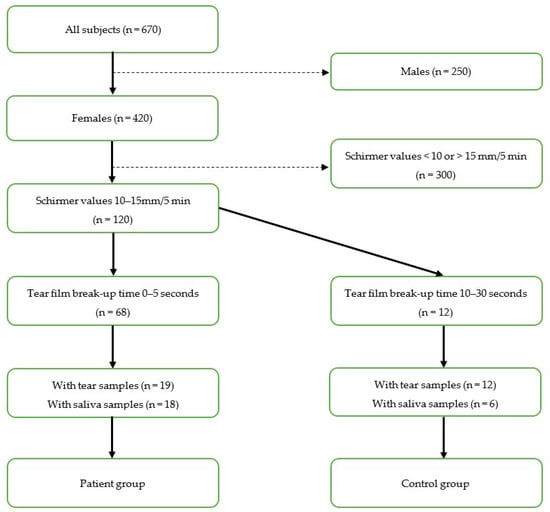 This study is a part of a larger research project that was performed in collaboration between the Faculty of Dentistry, University of Oslo; the Norwegian Dry Eye Clinic; and the Department of Medical Biochemistry, Oslo University Hospital. The Norwegian Regional Committee for Medical and Health Research Ethics approved the study protocol (REK 2017/99), and the study was performed in compliance with the tenets of the Declaration of Helsinki. Patients visiting the Norwegian Dry Eye Clinic between March 2017 and February 2020 were included in the research project. Written informed consent was obtained from all subjects prior to participation. The study involved extensive evaluation of the ocular surface to characterize DED, tear sample collection with Schirmer test strips, and evaluation of oral dryness and saliva sample collection. To reduce noise in the interpretation of the analytical results, we made the groups as homogeneous as possible with respect to possible interfering factors. Therefore, we matched the age in the groups. Moreover, we selected only females with unanesthetized Schirmer values between 10–15 mm/5 min in at least one eye. Patients were assigned to the low TFBUT group if TFBUT was 0–5 s, hereby referred to as the patient group. Subjects with a TFBUT of 10–30 s were assigned to the high TFBUT group, hereafter referred to as the control group. Of a total of 670 subjects in the Norwegian Dry Eye Clinic, 420 were females, of whom 120 had Schirmer values between 10 and 15 mm/5 min. Sixty-eight patients had TFBUT 0–5 s. Of these 68 patients, we had access to tear and saliva samples from 19 and 18 patients, respectively. In the control group, we had access to tear samples from 12 subjects, and saliva samples from six subjects. The final number of participants in the tear film analysis arm and salivary analysis arm thus were 19 patients and 12 controls and 18 patients and six controls, respectively. The selection process is shown in Figure 1. Tear and saliva samples from the included subjects were subjected to metabolomic analyses. Comparative characteristics of the patient and control groups are shown in Table 1.