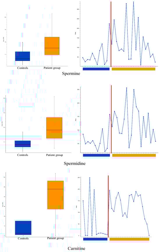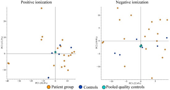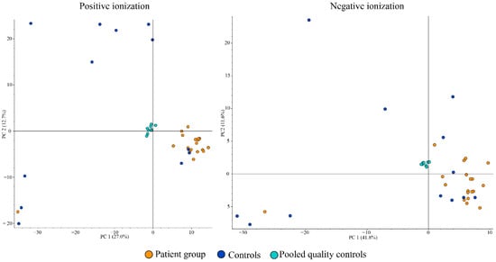 Statistical software: Compound Discoverer 3.1 (from Thermo Scientific) was used for data processing and statistical analyses, using the workflow template: “Untargeted Metabolomics with Statistics Detect Unknowns with ID using Online Databases and mLogic”. The statistical analyses used were principal component analysis (PCA), Shapiro–Wilk test to evaluate distribution of the data, and Mann–Whitney U-test to calculate the p-value of the differences between the groups. All results including two-tailed Student’s t-test and correction for multiple testing with the Benjamini–Hochberg method are included in Supplementary Table S1. Trend charts for each feature were created using the chromatographic peak area to compare the differences between all samples (trendline plot) and between patient and control groups (box–whisker plot).