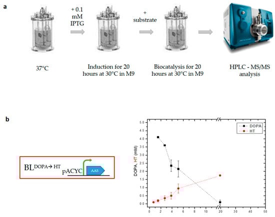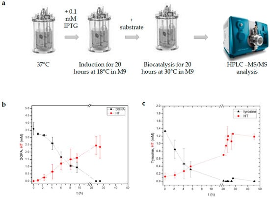 Since this might also have been the case in our experiments, we tested the whole-cell biocatalysis method with HT-producing strains in a small-scale set-up. In these experiments, in addition to the BLDOPA→HT strain, the BLTyr→HT strain was included. This strain of E. coli heterologously expresses tyrosinase from Rasltonia solanacerarum (RsTYR) and PcAAS and overexpresses a native ALRK. Thus, the substrate, tyrosine, is metabolized to HT by the diphenol or monophenol route [17]. In this experiment (Figure 2a), expression of heterologous proteins was induced in LB flasks previously inoculated with the proper strain (strain BLTyr→HT or BLDOPA→HT). For HT bioconversion, cell pellets of the overnight-grown cultures were incubated in M9 in the presence of the appropriate substrate (tyrosine or DOPA, respectively).