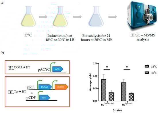 Whole-cell biocatalysis experiments for the production of hydroxytyrosol (HT) from various substrates. (a) Schematic presentation of the experimental procedure used. Two different temperatures, 18 °C and 30 °C, were used for the induction of the heterologously expressed protein in each strain. Two different strains of E. coli were used for the production of HT, one from tyrosine (strain BLTyr→HT) and one from DOPA (strain BLDOPA→HT). (b) Diagram showing the average yield of HT production from various substrates at the two different temperatures used. In all cases, higher yields of HT were observed when induction was performed at 18 °C. Statistical analysis was performed with one-way ANOVA (* p < 0,05; 2–3 biological replicates were used for each experiment).