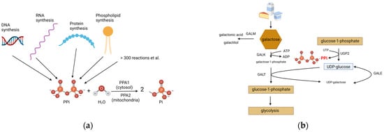 Sites of cellular PPi formation and details of galactose metabolism. (a) The majority of PPi is produced through four pathways: DNA, RNA, protein and phospholipid synthesis. Many more pathways contribute to the PPi concentration in the cell. PPi is hydrolyzed by differently localized PPA (PPA1/PPA2) to two molecules of Pi. (b) UDP-glucose is produced out of glucose-1-phosphate, which produces PPi. UDP-glucose is necessary for the breakdown of galactose, which is further metabolized in glycolysis. Abbreviations: UTP, uridine diphosphate; PPi, pyrophosphate; PPA, pyrophosphatases; Pi, orthophosphate. This figure was created with BioRender.com.
