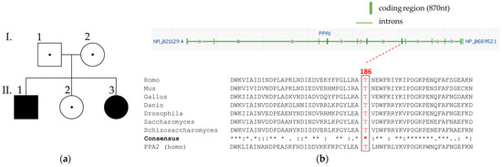 Pedigree of the family, PPA1 variant and conservation of affected amino acid position. (a) Pedigree structure of an Austrian family with non-consanguineous parents. The oldest boy (II.1) and the youngest girl (II.3) were homozygous for the PPA1 variant. (b) Genomic structure and location of the PPA1 variant (GenBank NM_021129.4). The green-filled boxes show exons, and the green lines indicate intronic regions. The red line shows the position of the missense variant. Phylogenetic analysis of PPA1 is shown by multiple sequence alignment carried out with Clustal Omega algorithm. PPA2 (GenBank NM_176869.3), nt: nucleotides, *: conservation of amino acids.
