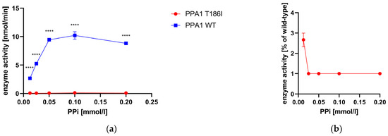 In order to confirm that the reduced pyrophosphatase activity in the 10,000× g supernatant of fibroblasts (Figure 4) was due to PPA1 deficiency, we expressed wild-type and mutant PPA1 in E. coli and purified the recombinant proteins. Additionally, the pyrophosphatase activity of recombinant proteins showed a clear decrease for the p.Thr186Ile variant. Like in fibroblasts, a higher residual activity was observed at low PPi concentrations (Figure 5), which might indicate that the variant is still sufficiently active under steady-state metabolic conditions. On the other hand, a PPi challenge, e.g., from the diet, might be risky.