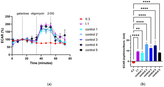 ECAR with galactose in fibroblasts. (a) ECAR in % from two independent measurements (number of measurements: affected individual (II.3): n = 13, heterozygous father (I.1): n = 15, control 1 n = 8, control 2 n = 7, control 3 n = 13, control 4 n = 4, control 5 n = 7). (b) ECAR in mpH/min/Norm. Unit after the addition of 5 µM oligomycin. Norm. Units illustrate normalized extracellular acidification rate. Bar chart shows galactolytic capacity of the cells. (a,b) Error bars show the standard error of the mean (SEM). ** p < 0.01, **** p < 0.0001.