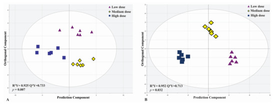 PLS-DA analysis shows distinct separation among three MSC-treated dosage subgroups (low-, medium- and high-dose) with strong predictability (Q2Y = 0.864, Q2Y = 0.713) and significant models (p = 0.009 and p = 0.032) for both HILIC-MS (A) and 1H-NMR (B) datasets.