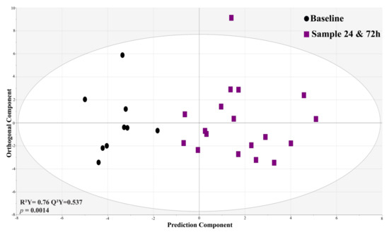 We investigated the metabolite alterations within each MSC-treated and nontreated cohort to understand how metabolomic profiles change over time after receiving MSC treatment compared to metabolites at baseline. HILIC-MS data showed a significant (p = 0.0014) and predictable (Q2Y = 0.537) metabolic alteration between baseline samples and samples at 24 and 72 h in the MSC-treated cohort (Figure 5). The validity of R2 and Q2 values was confirmed using permutation testing with 200 repetitions (Figure S13A–D).