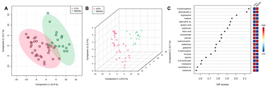 At 7 DIM, the fold-change analysis revealed that when comparing HTH to MET groups, 49 metabolites were upregulated, and 22 metabolites were downregulated. The top 50 metabolites are presented in Table 3. The PLS-DA with known metabolites at 7 DIM confirmed the differences observed in the uterine metabolome, indicating a dispersion in metabolite profile between HTH and metritic cows (Figure 4A,B). The top 20 uterine metabolites detected via PLS-DA and ranked by variable importance projection (VIP) scores resembled most of the metabolites identified as different based on the fold-change analysis (Figure 4C).
