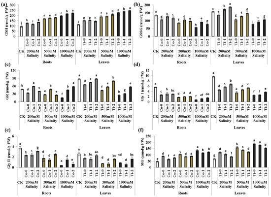 Alhammad, B.A.; Saleem, K.; Asghar, M.A.; Raza, A.; Ullah, A.; Farooq, T.H.; Yong, J.W.H.; Xu, F.; Seleiman, M.F.; Riaz, A. Cobalt and Titanium Alleviate the Methylglyoxal-Induced Oxidative Stress in Pennisetum divisum Seedlings under Saline Conditions. Metabolites 2023, 13, 1162. https://doi.org/10.3390/metabo13111162