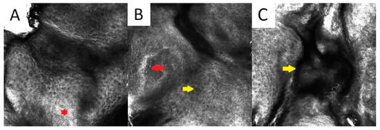 Reflectance confocal microscopy of disseminated superficial actinic porokeratosis: epidermal layer with parakeratosis (red asterisk) (A), elongated vessels in the lower parts of the epidermal layer (red arrow) and spongiosis (yellow arrow) (B), hyperkeratosis in the epidermal furrow (yellow arrow) (C).