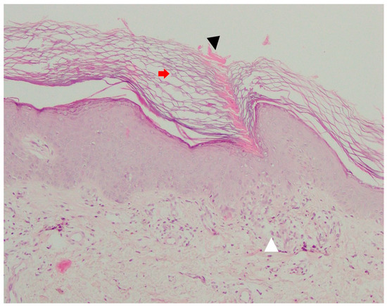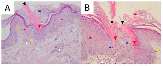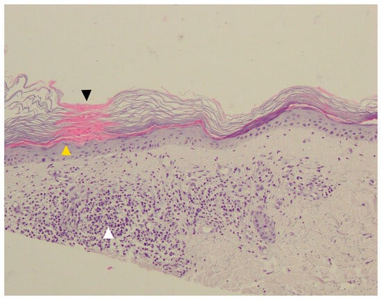 As the histological features of DSP and ESP overlap with DSAP, differentiating these two entities based on pathology seems impossible without the clinical context. The salient features include the presence of a cornoid lamella, sublamellar agranulosis, dyskeratotic keratinocytes and/or vacuolisation in the basal layer and melanophages in the upper dermis [195,214,246]. Equally, a perivascular inflammatory infiltrate (predominantly consisting of CD4+ T-helper cells mixed with Leu-6+ Langerhans cells) and mild orthokeratotic hyperkeratosis may be observed [174,178,184,240,247,248,249]. Dermal/epidermal eosinophilic infiltrate might be demonstrated in ca. 25–50% ESP cases [174,178,182,250], whereas basophilic infiltrate was reported in only one case [174]. Mast cells are absent and seemingly do not play a role in pruritus in EDP [174]. CD8+ Treg cells are suspected to drive the spontaneous regression in some EDP cases [174,251].