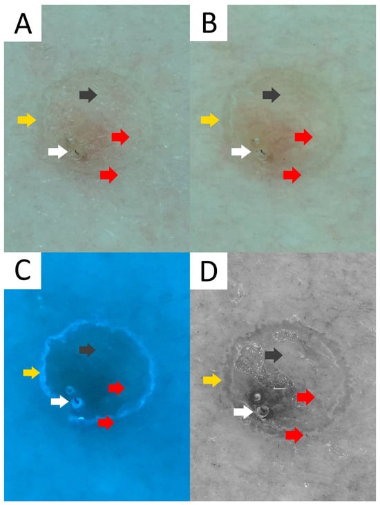 Comparison of conventional non-contact non-polarised dermatoscopy (A) and non-contact polarised dermatoscopy (B), with novel imaging techniques, namely ultraviolet-induced fluorescence dermatoscopy (UVFD; 365 nm) (C) and sub-UV reflectance dermatoscopy (sUVRD; 405 nm) (D). Note the differences in visualisation of annular keratin rim (yellow arrow), inner pink structureless area (black arrow), follicular plugging (white arrow) and vascular pattern of dots (red arrow).