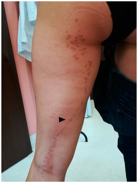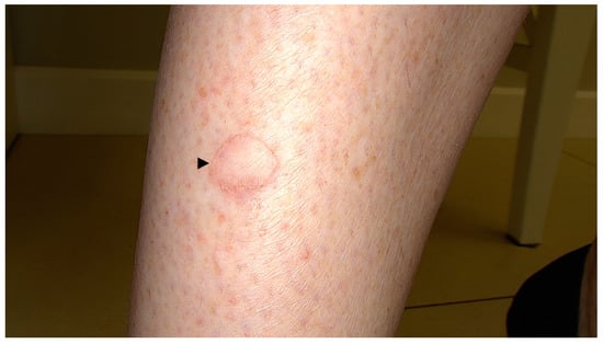 DSAP, initially described by Chernosky and Freeman in 1967 [16], usually presents as multiple pink or brown annular atrophic/keratotic macules and papules, usually with a diameter of <1 cm, located particularly on sun-exposed areas, including the extensor surface of the arms and lower extremities (Figure 1) [1,13,17,18]. In about 15% of cases, the lesions appear on the face [19]. Small papules of DSAP slowly progress into keratotic plaques characterised by a keratotic rim, which might be enhanced using exogenous pigmenting agents, such as povidone–iodine [20], fake tan lotion [21], gentian violet [22,23] but also permanent marker or ink. Skin lesions in sporadic form usually develop in the third and fifth decade of life [1,18,24], but familial DSAP usually manifests at a younger age (3rd–4th decade) [19,24]. Female predominance has been reported [25]. Ultraviolet light is one of the exacerbating factors [1,26,27]. Rarely, DSAP develops bullous [28] or prurigo nodularis-like forms [29]. There are reports of non-actinic DSAP in immunocompromised patients (organ transplant recipients, oncological patients, HIV-positive patients and others) [28,30,31,32,33,34,35,36,37], pyoderma gangrenosum [34], pseudoxanthoma elasticum [38], dermatomyositis [39], systemic scleroderma [40], Sjögren’s syndrome [41], in combination with glioblastoma and Lynch syndrome [42] and during hydroxyurea treatment [43,44].