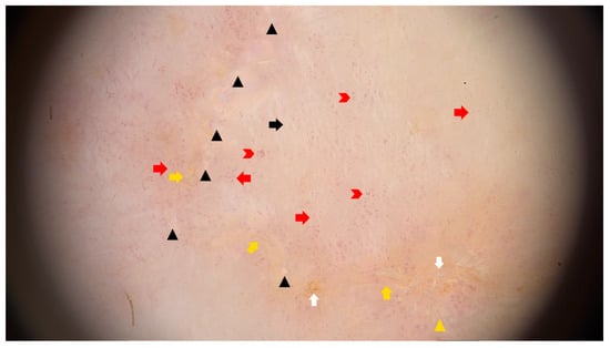 Dermatoscopy of porokeratosis of Mibelli reveals a central hypopigmented area with polarising-specific white lines (black arrow), small white areas (black arrowheads) and dotted and coiled vessels (red arrows and red V-shaped arrows, respectively) surrounded by an interrupted yellowish keratin rim with a double-edged outline (“white track”) (yellow arrows). Within this rim, follicular plugs can be seen (white arrows). Of note, dotted vessels and radially arranged peripheral scaling (yellow arrowhead) can be seen at the lesion’s outer margin (magnification 20×).