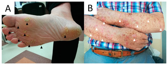 - Beers, B.; Jaszcz, W.; Sheetz, K.; Hogan, D.J.; Lynch, P.J. Porokeratosis Palmaris et Plantaris Disseminata. Report of a Case with Abnormal DNA Ploidy in Lesional Epidermis. Arch. Dermatol. 1992, 128, 236–239. [Google Scholar] [CrossRef]