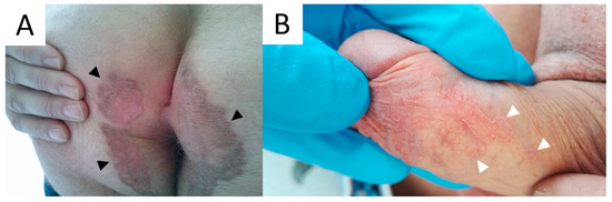 - Qian, Y.-T.; Vano-Galvan, S.; Liu, J.-W.; Liu, W.; Ma, D.-L. Porokeratosis Ptychotropica on the Penis and Scrotum: A Case Report. Acta Derm. Venereol. 2019, 99, 246–247. [Google Scholar] [CrossRef]
