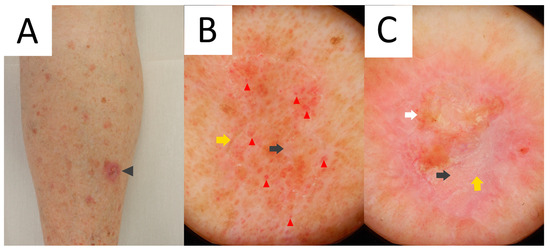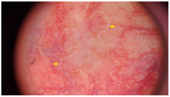 The majority of publications concerning the dermoscopy of porokeratosis are case reports [14,65,66,67,68,69]. In 2021, members of the International Dermoscopy Society performed a retrospective cohort study of 77 patients from 11 different countries. The most common dermatoscopic features of DSAP reported in the study included a keratin rim and the presence of associated structures (vascular and non-vascular) within the rim [14,70]. This keratotic rim corresponds to cornoid lamella and proved to be a highly specific clue, present in almost all DSAP cases (Figure 2) [14,66,67,68,69,71]. Among the vascular structures, dotted or glomerular vessels were the most common findings, especially on the lower extremities [14,65]. Additionally, non-peripheral scales were reported to be present in around half of the cases, and these were the predominant non-vascular clues observed within the keratotic rim. Moreover, dermatoscopy of DSAP might reveal grey–brown dots or pigmentation along the keratotic rim [14,65,68,69], polarising-dependent shiny white structures [14], linear serpentine and linear serpentine branching vessels, polymorphous vessels and peripheral vascularisation [14,67,69]. Some of these latter findings (e.g., polymorphous vessels and shiny white structures) might be concerning for cutaneous malignancy. Thus, some of these cases might require a biopsy (see below). Even though both DSAP and PM were reported to share all the abovementioned clues, DSAP demonstrated fewer blood spots and erosions, whereas the brown pigmentation in DSAP was lighter than in PM [14]. A pigmented variant of DSAP has also been described [13,72,73]. Its frequency was estimated to be 25.8% in a retrospective study from New Zealand [72]. So far, only a single dermatoscopic report on that variant exists, with a well-demarcated, roundish, hyperpigmented periphery composed of black dots and a central clearing [13,73].