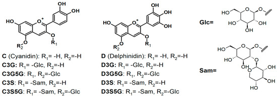 For conducting the experiments, we utilized a maqui berry powder known as CHI2, which was obtained from the Ecuadorian Rainforest, LLC, Clifton, NJ, USA. This powder is derived from a whole fruit that is ground to be rich in anthocyanins (600 mg/100 g d.w. as per HPLC analysis). This fruit also contains other beneficial compounds such as ellagic acid derivatives (14 mg/100 g d.w.), flavonols (24 mg/100 g d.w.), and chlorogenic acid (9 mg/100 g d.w.) [15]. Glycosides and di-glycosides of delphinidin and cyanidin were recognized as the principal anthocyanidins found in MB. In previous works, Delphinidin and its derivatives Delphinidin 3-O-glucoside, Delphinidin 3,5-O-diglucoside, Delphinidin 3-O-sambubioside, and Delphinidin 3-O-sambubioside-5-O-glucoside, together with Cyanidin, and its derivatives Cyanidin 3-O-glucoside, Cyanidin 3,5-O-diglucoside, Cyanidin 3-O-sambubioside, and Cyanidin 3-O-sambubioside-5-O-glucoside, were found as its principal components of the water extract of maqui fruits [10] (Figure 1).