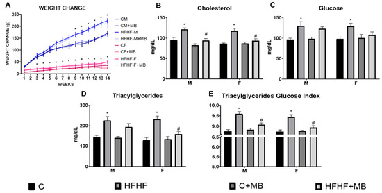 The effect after 14 days of MB administration on metabolic parameters associated with MetS on the in vivo model (A) Weight Change (B) Glucose, (C) Cholesterol, (D) Triacylglycerides, and (E) Triacylglicerides-glucose index. After 14 days of treatment with MB, the HFHF+MAQUI groups had a statistically significant reduction of all MetS parameters analyzed compared to the HFHF groups. Data are presented as means ± standard deviation (SD). * Represents statistically significant differences between groups compared to their own control group (HFHF groups vs. C groups) (p < 0.05). # Represents statistically significant differences between HFHF groups vs. HFHF+MB (p < 0.05).