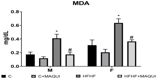 Effects of normal diets and a diet rich in fructose 30% + fat 10% on the determination of MDA in serum of male and female rats. The columns represent the mean with n = 6. The bars represent the standard error of the mean. * = significant difference with respect to the respective control. # = significant difference to the group HFHF, p ≤ 0.05.
