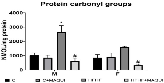 Effects of normal diets and diets rich in fructose 30% + fat 10% on the total protein carbonyls in the serum of male and female rats; the columns represent the mean with n = 6, and the bars represent the standard error of the mean. * = significant difference with respect to the respective control. # = significant difference to the group HFHF, p ≤ 0.05.