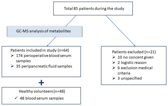 Pancreatic cancer (PC) has the highest mortality rate of all major cancers in the world despite improvements in clinical care and an understanding of the biology of pancreatic cancer [1]. Chemotherapy and surgery are the primary treatment options for PC. The high percentage of postoperative complications negatively affect patient survival, causing an increase in the volume of research to develop strategies to reduce them [2,3]. Many of these strategies involve the preoperative risk stratification of patients based on metabolic parameters and various biomarkers [4,5,6,7]. Despite numerous cancer studies using metabolomic approaches and promising results, these studies still highlight the heterogeneity of metabolic features and behaviors used by tumor cells that go beyond the simple rewiring of anabolic and catabolic pathways [8]. Currently, metabolomics is capable of profiling more than 200 small molecule metabolites with important biological functions, with broad coverage of numerous important metabolic pathways, including the tricarboxylic acid cycle (TCA cycle), glycolysis, amino acid metabolism, etc., which are reported to be closely related to the pathogenesis of PC [9,10]. Succinate was recently shown to play a key role in tumorigenesis; it may have both pro- and antitumor efficacy. Therefore, research on succinate may improve our understanding of cancer pathogenesis [11]. In pancreatic cancer, disturbances in amino acid metabolism can lead to changes in the signaling system of molecules responsible for the development of the cancer process, and therefore changes in amino acid profiles can serve as promising diagnostic, prognostic, and therapeutic targets. [12,13]. One of the promising markers for monitoring infectious complications in surgical patients, reflecting microbiota dysfunction, could be aromatic microbial metabolites, but their role in cancer has not been studied [14,15].