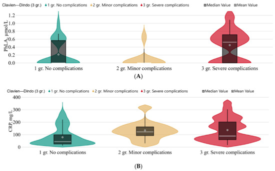 The concentrations of: (A) phenyllactic acid, µmol/L; and (B) C-reactive protein (CRP), mg/L according to Clavien–Dindo classification complications scale in point 1. Green—no complications (n = 28); yellow—minor complications (grades I–II) (n = 10); red—severe complications (grades III–V) (n = 24).
