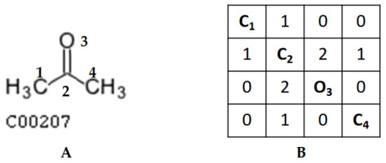 Example of matrix representation of a compound structure: (A) KEGG compound C00207 with the atoms numbered for comparison to rows and columns in the matrix; (B) matrix representation of KEGG compound C00207.