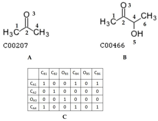 Example of a mapping matrix between two compound structures: (A) KEGG compound C00207 with atoms numbered to rows in the matrix; (B) KEGG compound C00466 with atoms numbered to columns in the matrix; and (C) mapping matrix between KEGG compound C00207 and KEGG compound C00466.