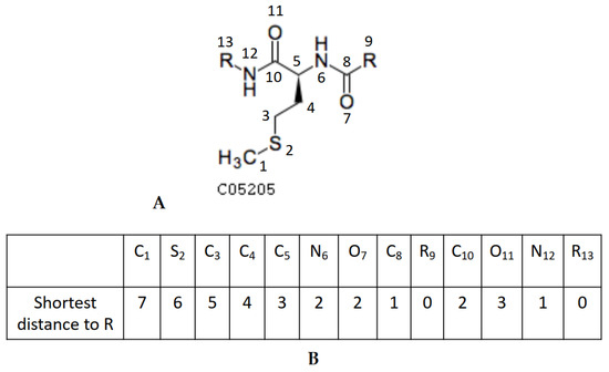 Shortest distance to the R groups in a compound structure. (A) KEGG compound C05205 with atoms numbered to indeces in the array; (B) the array of the shortest distance from each atom to R groups in KEGG compound C05205.