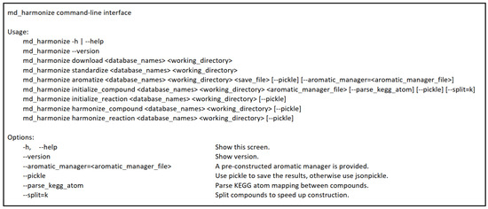 The md_harmonize package provides a simple command-line interface to perform data standardization, aromatic substructure detection, and compound and reaction harmonization. Figure 8 shows version 1.0 of the command-line interface.