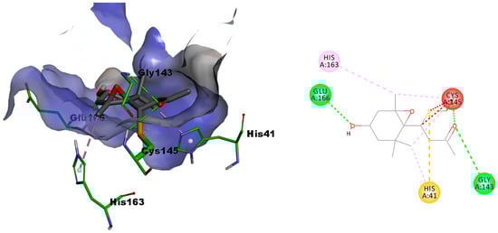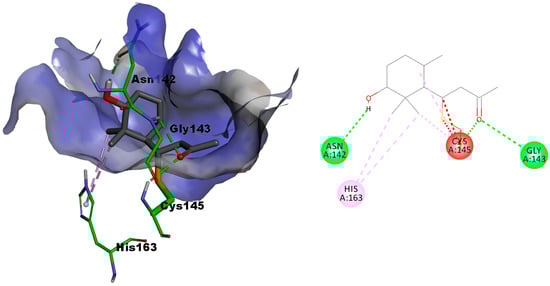 In addition to establishing a covalent interaction with the catalytic cys145, it established a network of favorable interactions involving two hydrogen-donor bonding interactions between the compound 1 oxygen atom of the carbonyl group and the backbone NH of both of Cys145 and Gly143 and one hydrogen bond acceptor between the compound 1 OH group and the side chain carbonyl group of Asn142, as well as two hydrophobic π-alkyl interactions between both vicinal methyl groups of compound 1 and the imidazole ring of His163. Compound 2, as shown in Figure 5, also docked successfully into the active site of Mpro of SARS-CoV-2 with an almost similar docking score to compound 1 (docking score of −4.85742 kcal/mol for compound 2 versus docking score of −4.89957 kcal/mol for compound 1). As illustrated in Figure 2, the oxygen atom of the carbonyl group of 2 still maintains the two hydrogen donor bonding interactions with the backbone NH of both Cys145 and Gly143.