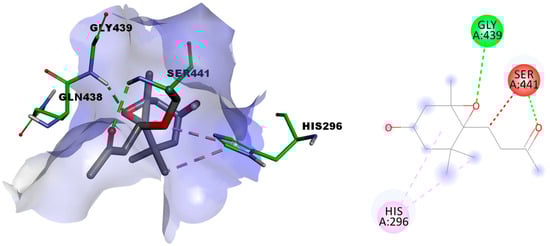 Additionally, it formed other favorable interactions with other amino acid residues inside the active site, where a hydrogen-bond donor interaction was formed between the oxygen atom of the carbonyl moiety, as in compound 1, but here with Ser441 of the catalytic triad of the active site. Moreover, the epoxy group of 2 contributed successfully to a hydrogen-bond donor interaction with Gly439. This interaction suggested that the epoxy functionality was of interesting value, regarding the interaction of compound 2, in contrast to compound 1. Furthermore, two favorable hydrophobic π-alkyl interactions were formed between His296 of the catalytic triad of the enzyme with each cyclohexane ring and one methyl group of the two vicinal methyl groups of 2.